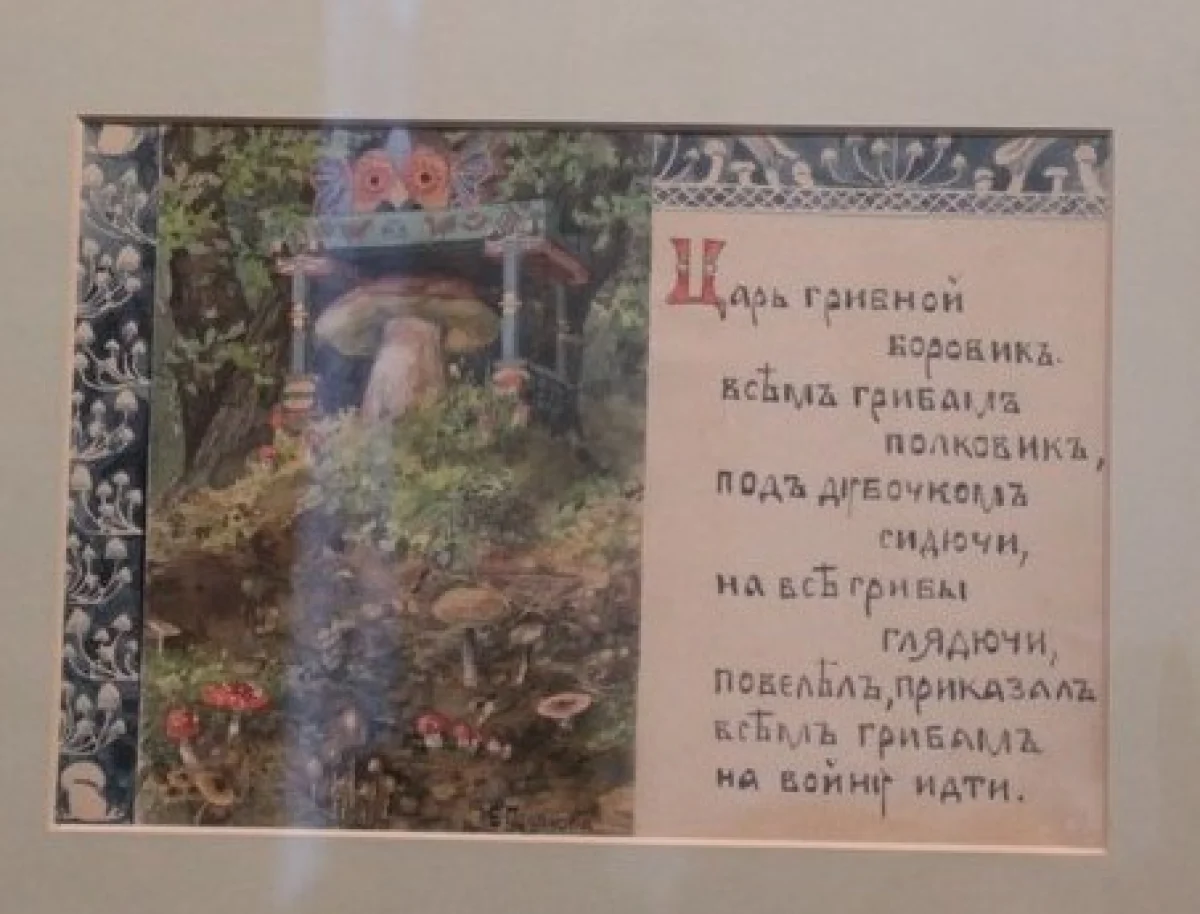 Елена вошла в историю как одна из первых иллюстраторов русских сказок. Любимая с детства «Война грибов», рассказанная бабушкой по дороге в имение Ольшанка, ожила в её рисунках. На выставке вы увидите некоторые из ним.