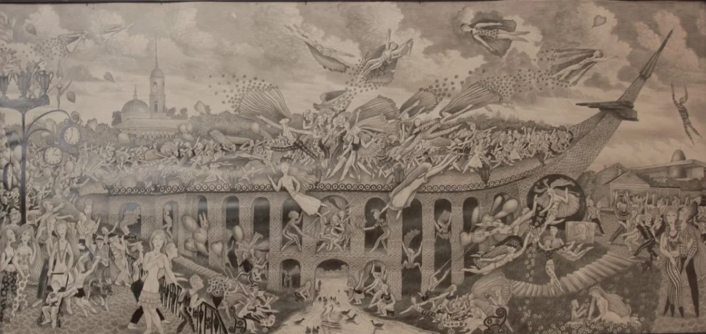 На картине «Праздничный шаг в открытый космос» древний Каменный мост становится сценой для фантастических событий: здесь парит в мечтах весёлая молодежь, а внизу, вместо привычного оврага, раскинулся благоустроенный парк с чистой речкой.