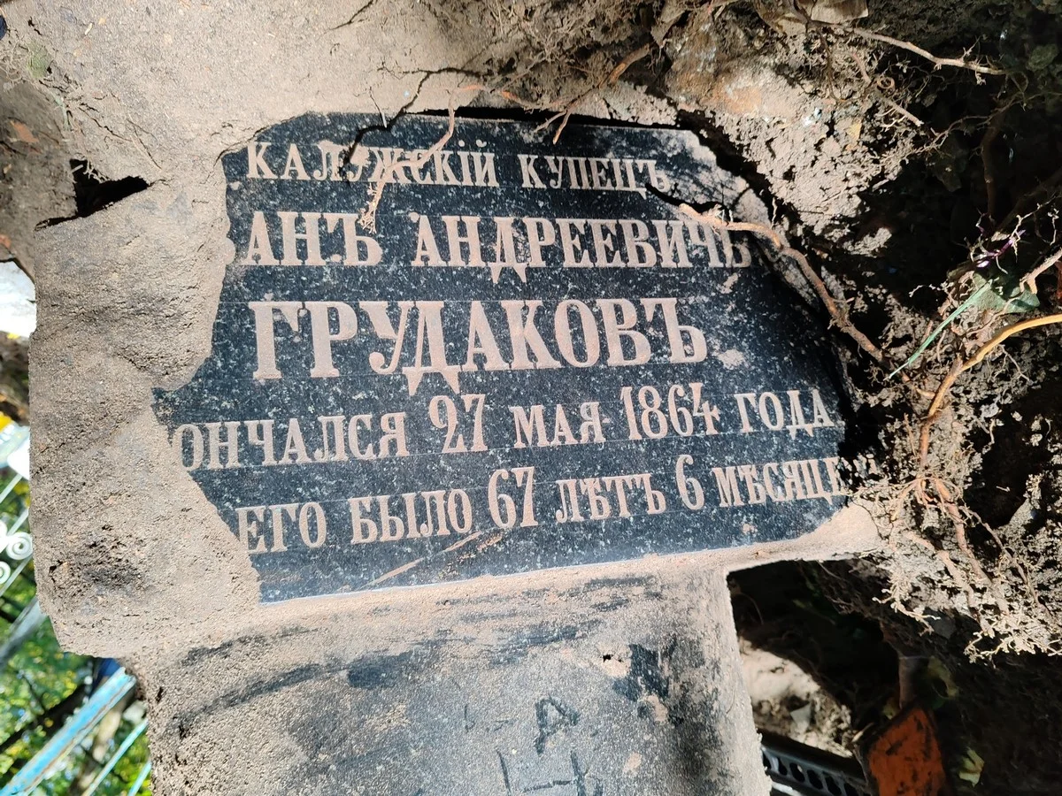 Эта работа позволила вернуть из небытия восемь имен, включая захоронение калужского купца Ивана Андреевича Грудакова, скончавшегося 27 мая 1864 года «жития его было 67 лет 6 месяцев».