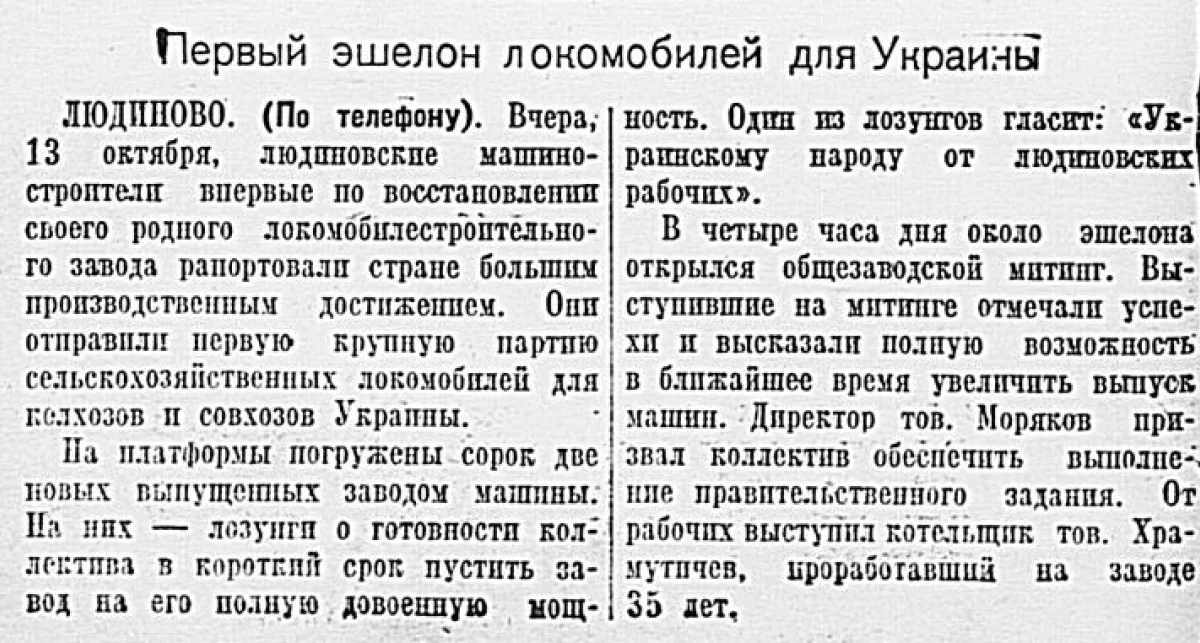 13 октября людиновские машиностроители впервые после восстановления своего родного локомобилестроительного завода рапортовали стране большим производственным достижением. Они отправили первую крупную партию сельскохозяйственных локомобилей для колхозов и совхозов Украины.