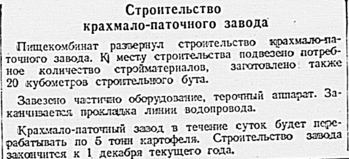 Крахмало-паточный завод в течение суток будет перерабатывать по 5 тонн картофеля. Строительство завода закончится к 1 декабря текущего года.