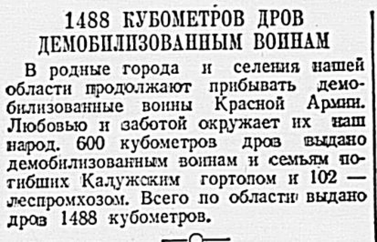 В родные города и селения нашей области продолжают прибывать демобилизованные воины Красной Армии. Любовью и заботой окружает их наш народ. 600 кубометров дров выдано демобилизованным воинам и семьям погибших Калужским торготделом и 102 — леспромхозом. Всего по области выдано дров 1488 кубометров.