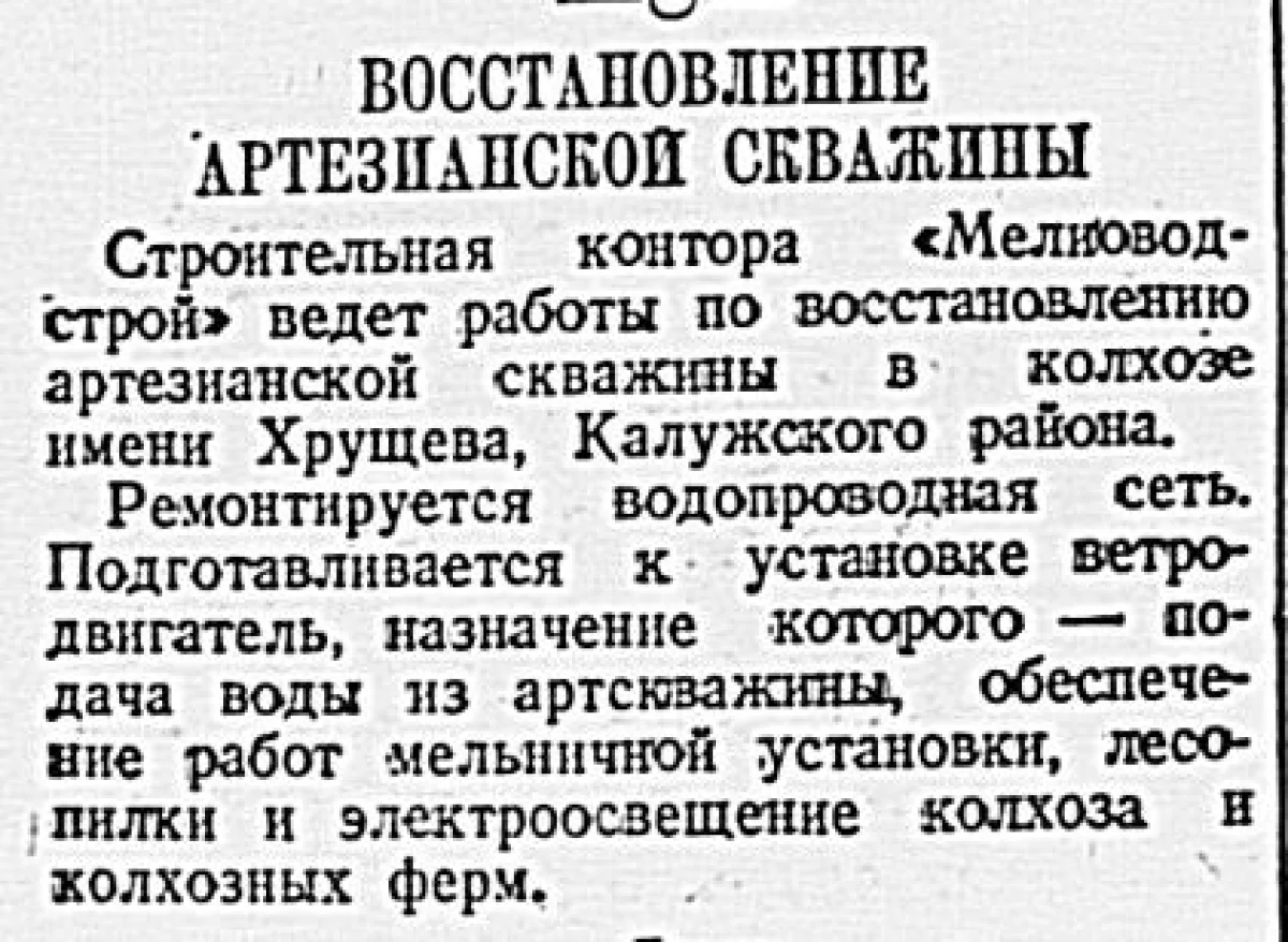 Строительная контора «Мелиоводстрой» ведет работы по восстановлению артезианской скважины в колхозе имени Хрущева Калужского района.