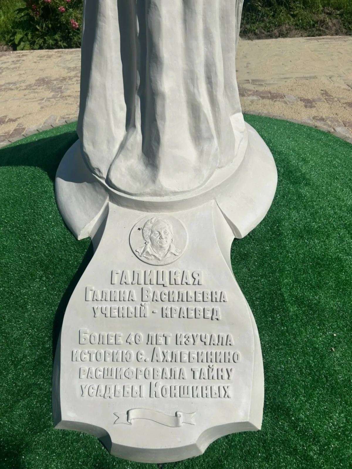 На постаменте надпись: «Коншиной-Реутовой Ирине Яковлевне от благодарных потомков». С обратной стороны — слова о краеведе Галине Галицкой, которая более 40 лет собирала материалы о селе Ахлебинино и жизни Ирины Яковлевны.