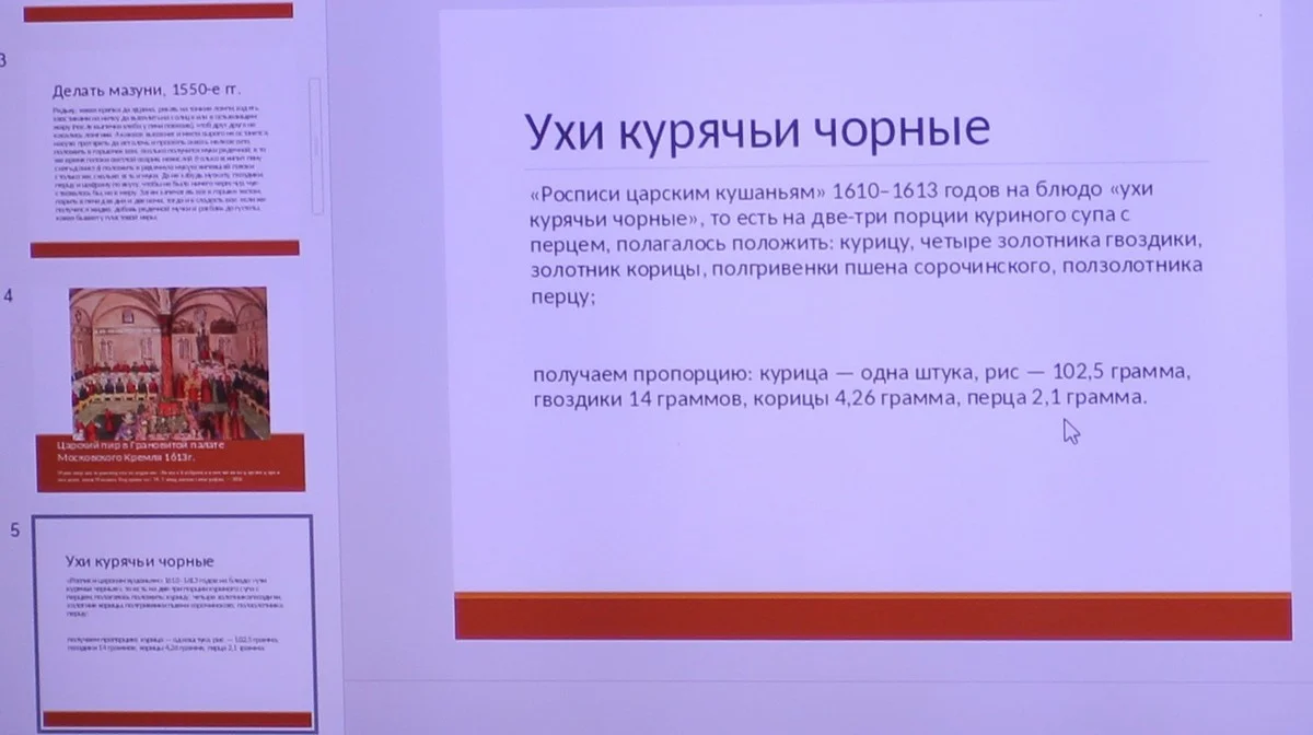 - На одну курицу (а мы помним, что куры в то время были маленькими) уходило 14 граммов гвоздики, 4 грамма корицы и 2 грамма перца. То есть, специй добавляли гораздо больше, чем мы используем сейчас, — удивила аудиторию Ангелина Иванова.