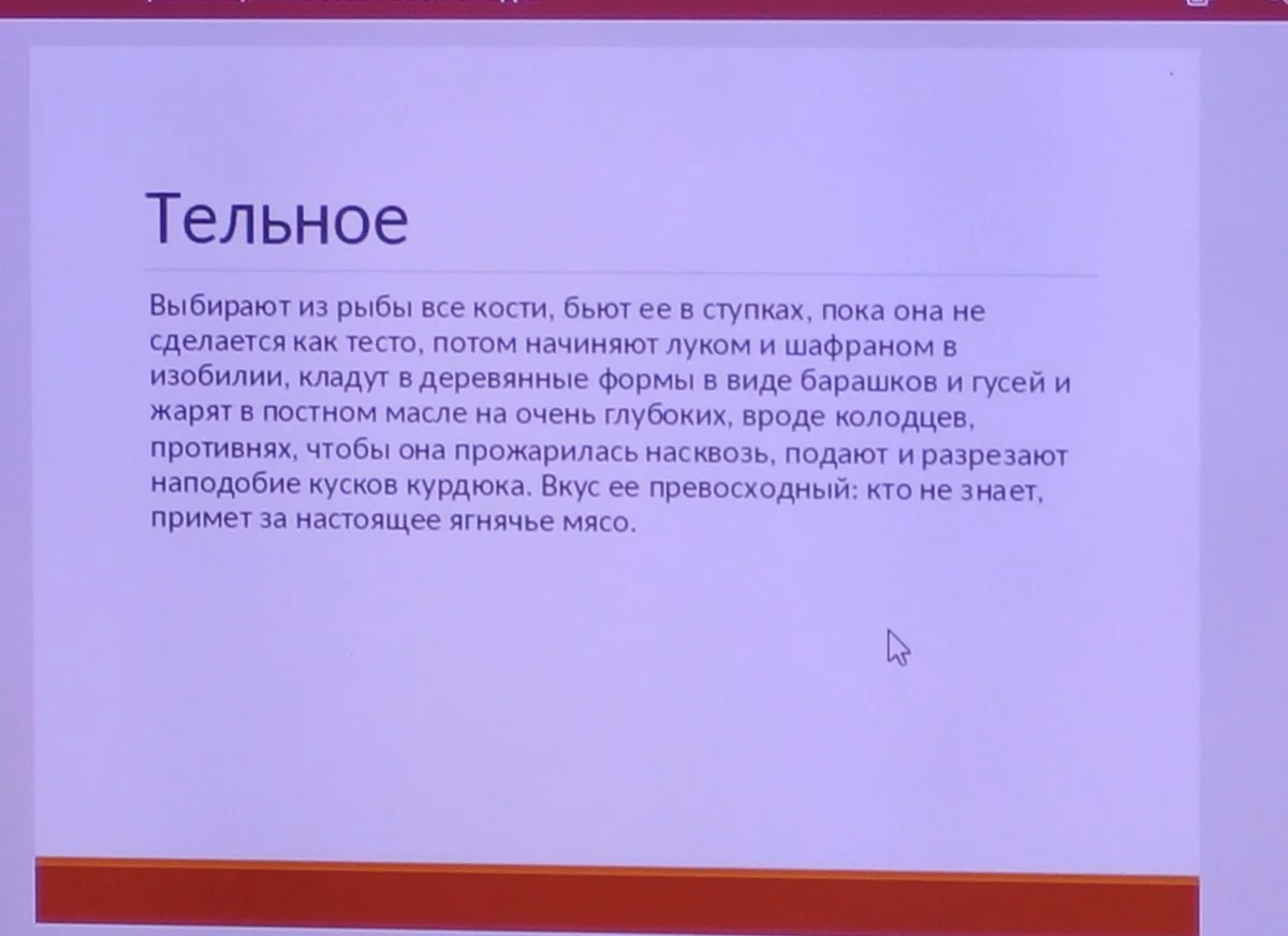 Любопытным блюдом было тельное. Рыбу перемалывали в фарш, клали в деревянные формы в виде животных и жарили.