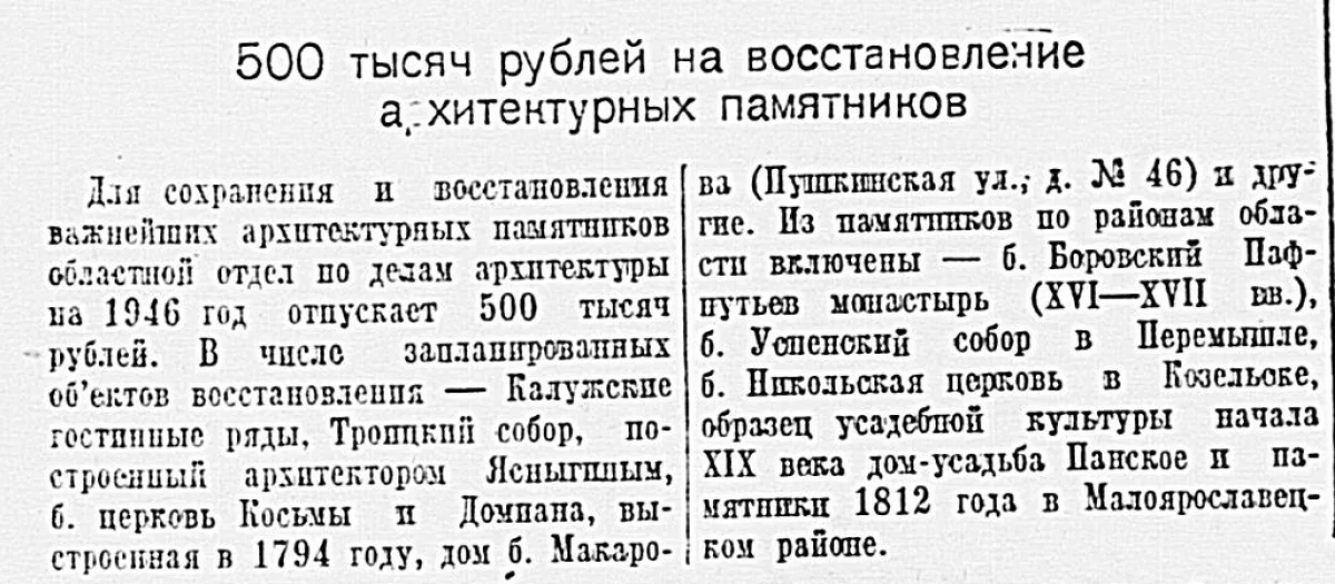 Для сохранения и восстановления важнейших архитектурных памятников областной отдел по делам архитектуры на 1946 год отпускает 500 тысяч рублей.
