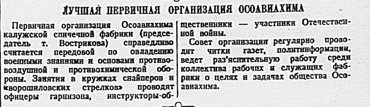 Первичная организация Осоавиахима калужской спичечной фабрики (председатель т. Вострикова) справедливо считается передовой по овладению военными знаниями и основами противовоздушной и противохимической обороны.
