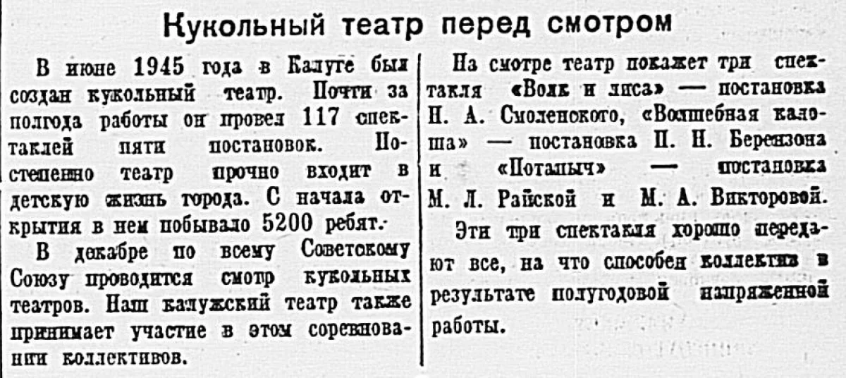 В июне 1945 года в Калуге был создан кукольный театр. Почти за полгода работы он провел 117 спектаклей пяти постановок. Постепенно театр прочно входит в детскую жизнь города. С начала открытия в нем побывало 5200 ребят.