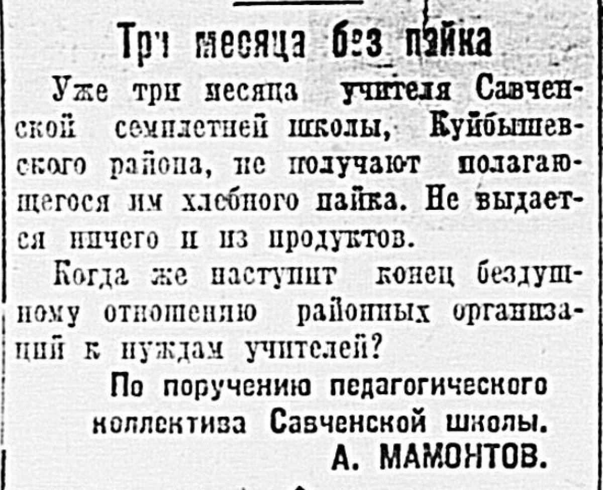 Три последних месяца учителя Савченской семилетней школы, Куйбышевского района, не получают полагающегося им хлебного пайка. Не выдается ничего и из продуктов.
