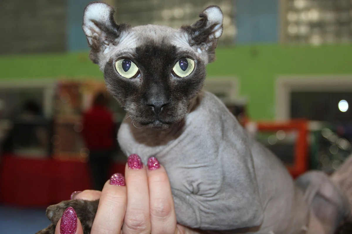 - Порода эльф, - говорит владелица Елена. - По характеру эти кошки очень добрые, дружелюбные, любопытные. Участвуют во всех домашних делах.