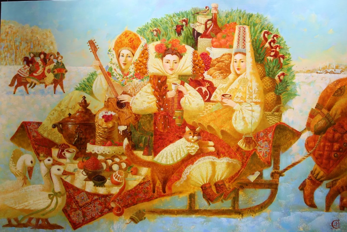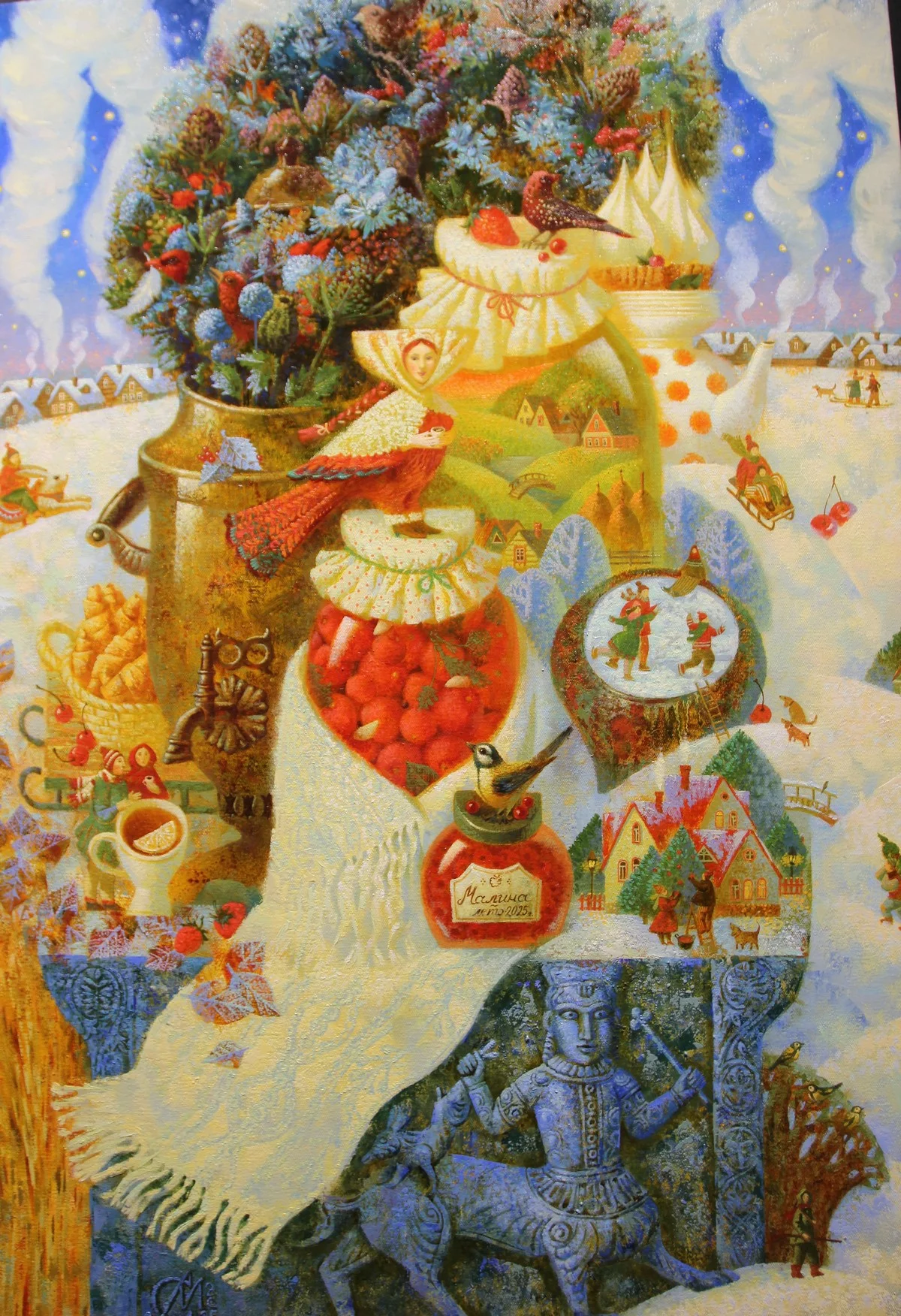 Всё здесь - и зима с санками, и весна с Масленицей, и малиновое варенье в баночках, и балалайки, и дома на деревьях.