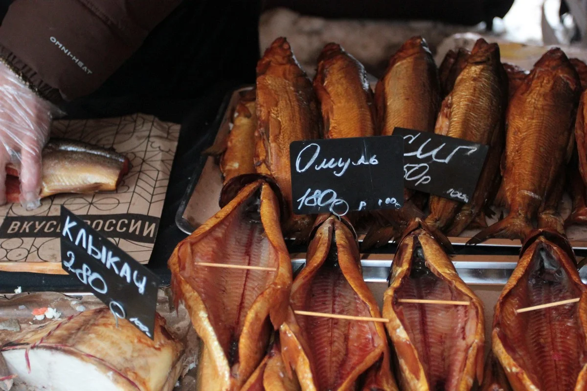 Самые большие очереди – к прилавкам с рыбой. Цены схожие: чавыча – 2900 руб./кг, форель – 2350 руб./кг, кета – 1500 руб./кг.