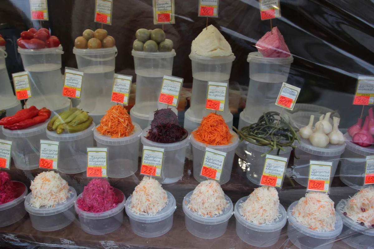 Овощи и соленья: Квашеная капуста – 250-350 руб./кг, мочёные яблоки – 300 руб./кг, солёные грибы (рыжики, маслята, грузди, опята)– от 1500 руб./кг.