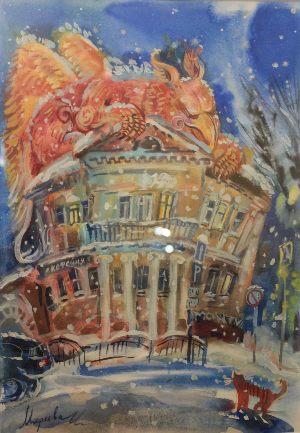 Одна из центральных работ - ангел и кот уютно устроились на решётке Каменного моста, как раз зимняя. И здесь - излюбленный мотив художницы: вид на Троицкий собор и Присутственные места.