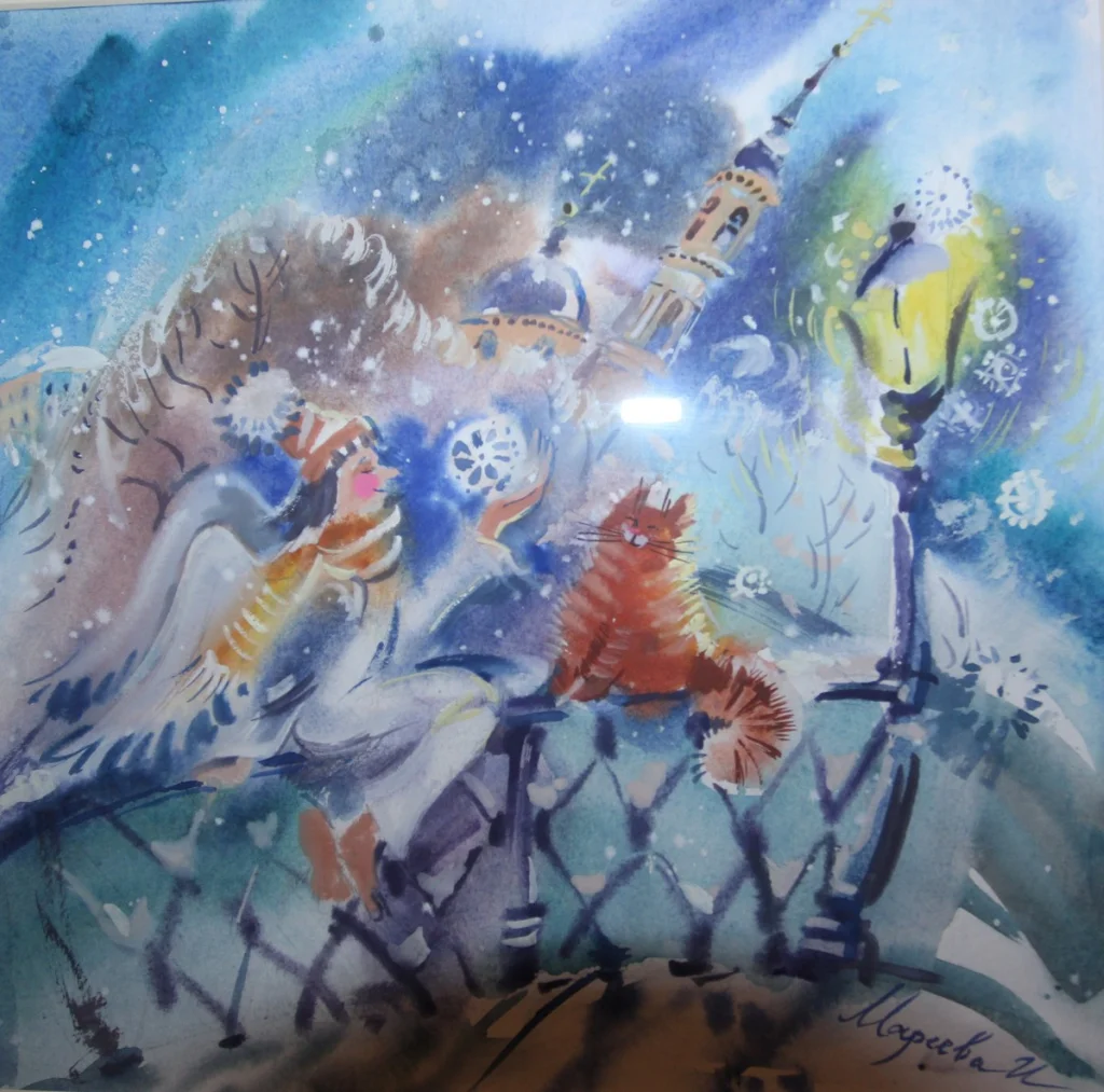 А пока в музее Батенькова можно согреться зимней сказкой: два котика, похожие на ракушки, свернулись у окна на картине «Уютный январь», а ангел с Каменного моста напоминает: «В каждом из нас есть добрый свет.