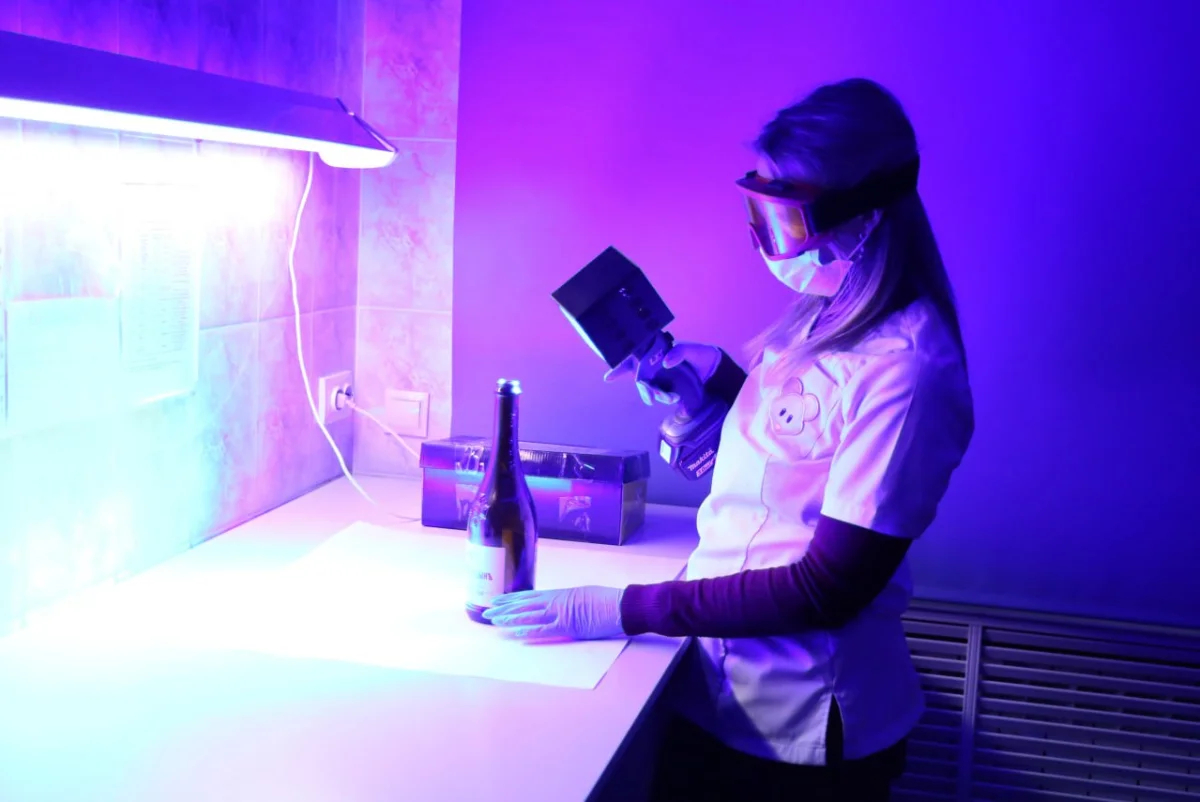 В лаборатории выключается свет, задергиваются плотные шторы и в абсолютной темноте объект просвечивается мощной ультрафиолетовой лампой. Яркие пятна на поверхности стекла проявляются отчетливо – это и есть искомый биоматериал. Точно также можно распознать следы на одежде и любой другой неорганической поверхности.