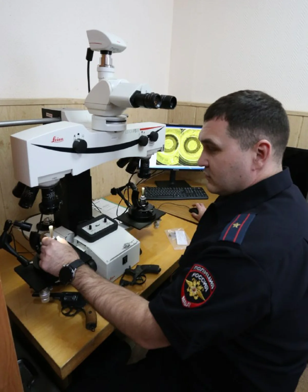 Отстрелянный боеприпас под микроскопом сравнивается с образцами из федеральной пулегильзотеки. Царапины, микро-вмятины, след на капсюле от бойка и от нарезов на пуле – все это составляет уникальный набор идентификационных признаков для любой отдельно взятой единицы оружия.