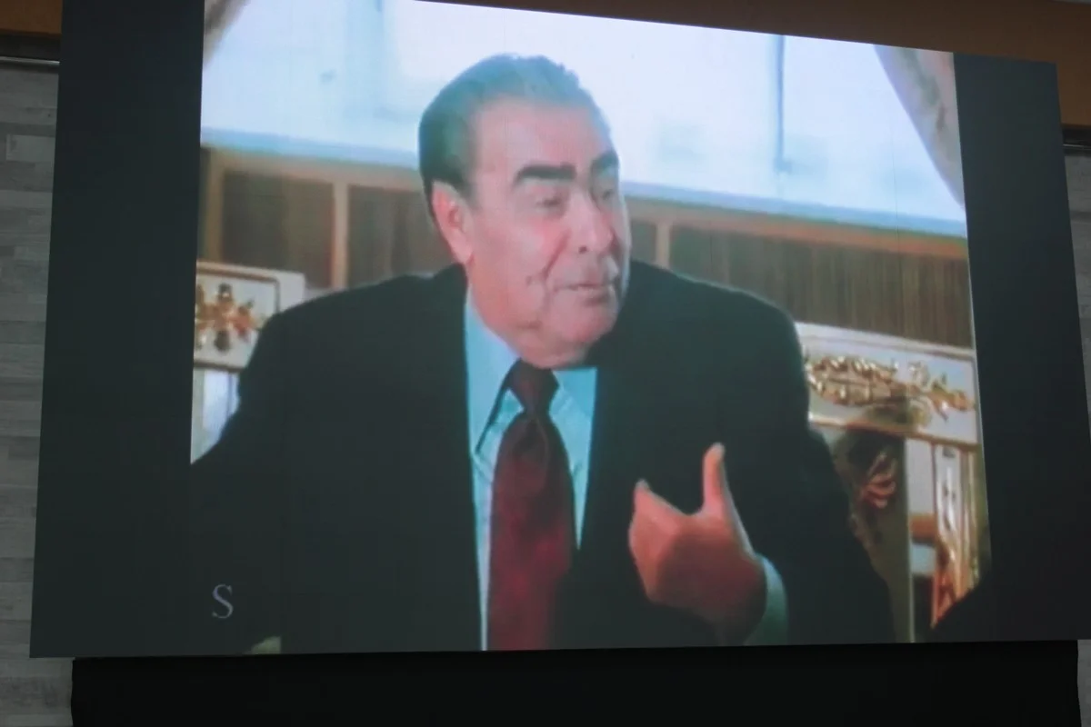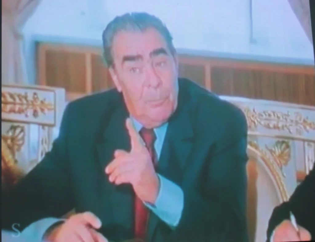 - Я должен сказать, что это не только крупное событие, а сверх того, что мы имеем. Это шедевр! Смотрел по телевизору, как вы там друг к другу лазали, - доносится с экрана голос Брежнева.