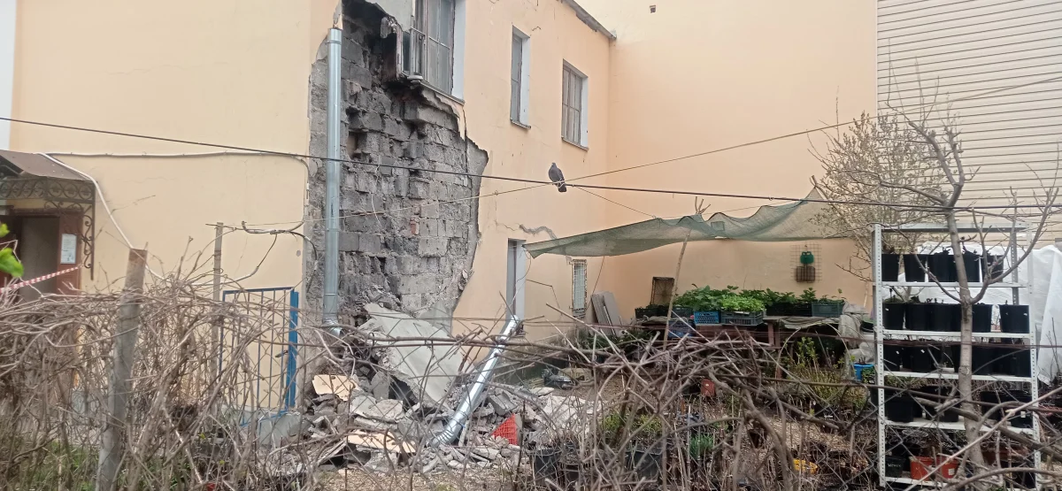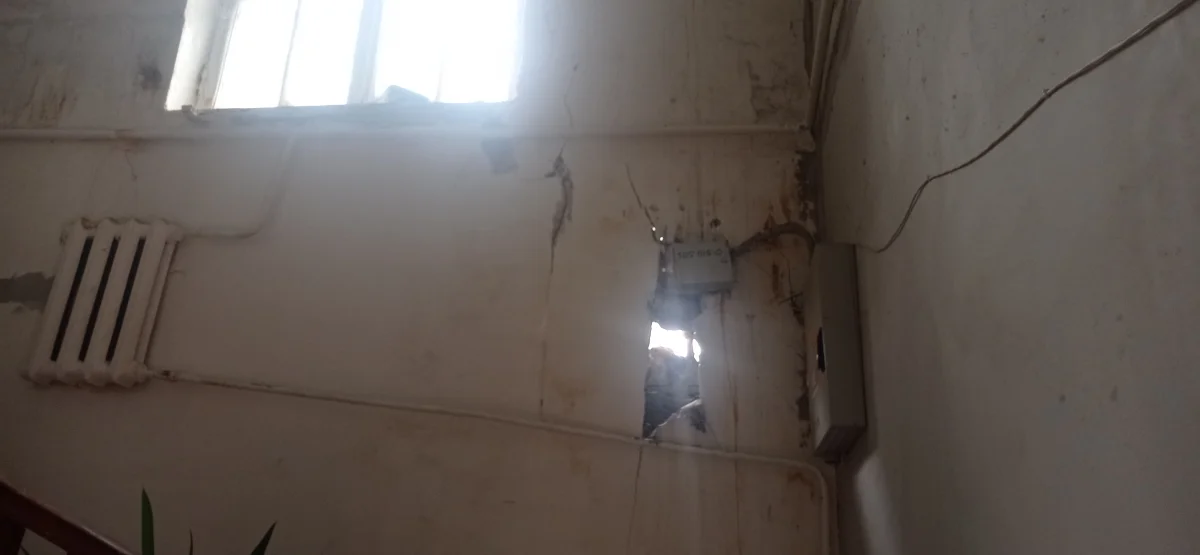 Выбежав из квартиры, пенсионерка увидела, что в стене подъезда зияет дыра, а лестница завалена пылью и камнями. Основная же часть обрушения пришлась на дворик, где она только что работала.