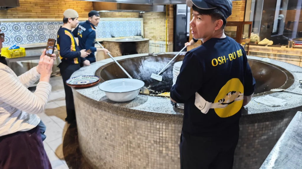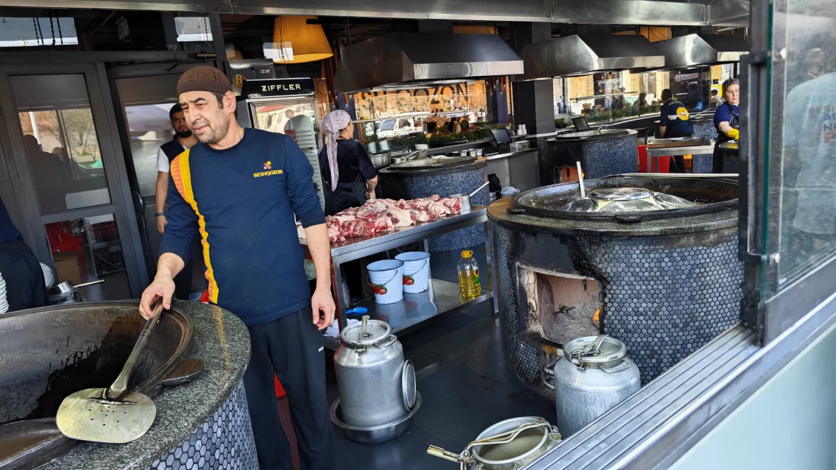 В ресторане «Беш Козон» за день готовят до десяти тонн плова трех видов. Здоровые казаны на входе поражают своими размерами, однако главный казан — это, что называется, полный отпад.