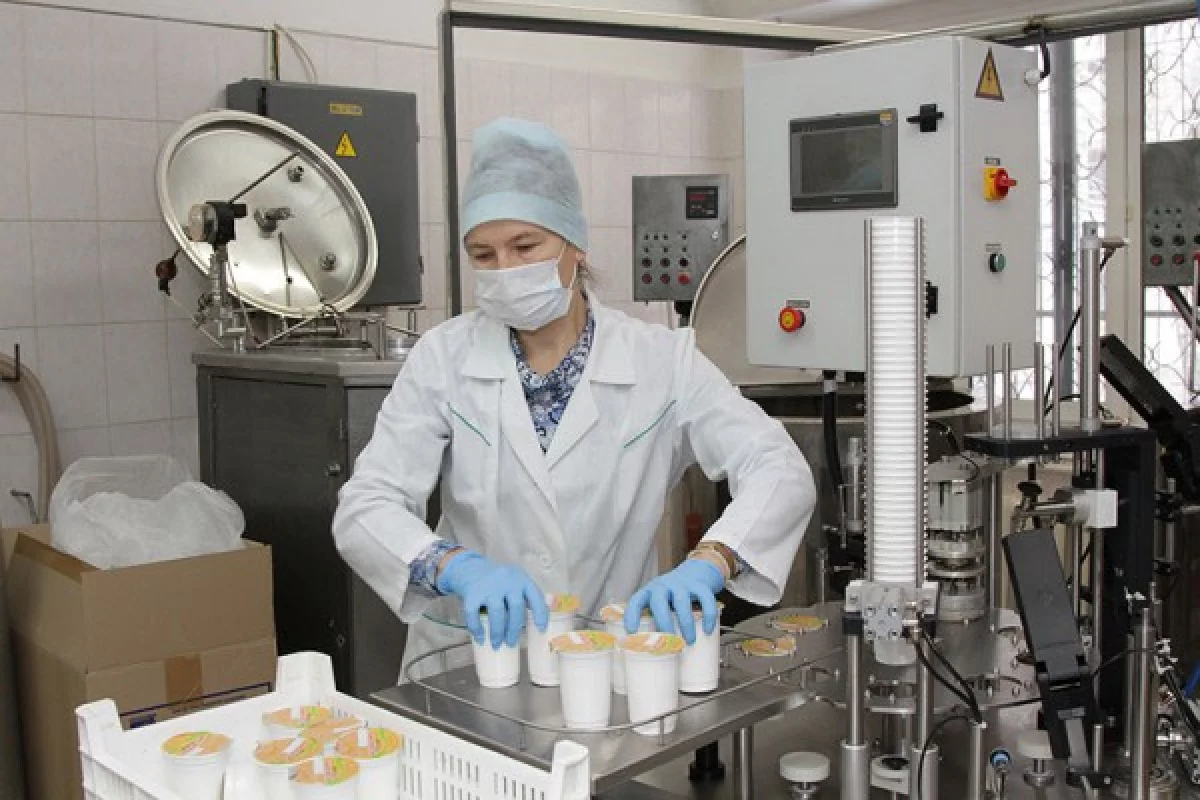 — Стаканчик обрабатывается бактерицидной лампой, — показывает оборудование Галина Николаевна. — Кисломолочка дозируется, крышечка кладется и запаивается, ставится маркировка. Выходит закрытый готовый продукт.