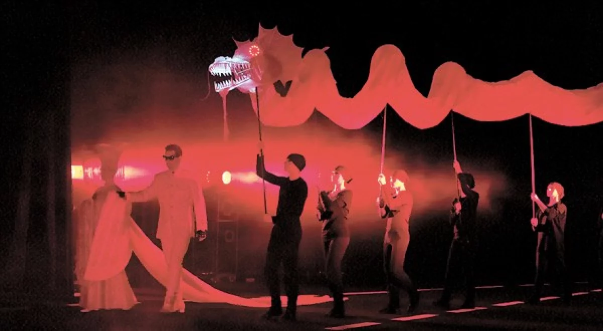 «Дракон» — дипломная работа художника-сценографа Арины Слободяник. Её творчество не поражает пышностью и дороговизной, но сдержанно и завораживает восприятие зрителя. Управляют нашим вниманием прежде всего ажурные конструкции над сценической площадкой, которые легко превращаются то в крыло Дракона, то в крылья самолёта, то в лёгкую ширму для театра теней. Театральная программка — отдельный шикарный сувенир. Дяденьки, а поставьте Арине «пятёрочку»!