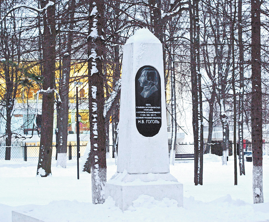 — Когда дом Гоголя сгорел, на его месте решили поставить памятник. И Никифорова-Кирпичникова сделала каменный обелиск с барельефом из бетона и надписью: «На этом месте стоял дом, где в такие-то годы жил Гоголь». Его установили в 1929 году. Перед губернаторским домом был сад (ныне — Парк Циолковского), который тянулся до обрыва к Яченке. И спортсмены захотели устроить там футбольное поле. Они выровняли землю, убрали уклон. Памятник им мешал. Его перенесли и поставили на аллее между двумя деревьями, не изменив текста. Так он и остался стоять с надписью о том, что здесь был дом Гоголя. А где здесь? Между двумя липами? Как там вообще дом мог поместиться? Потом обелиск сделали совсем из другого материала, а текст по невежеству оставили все тот же…