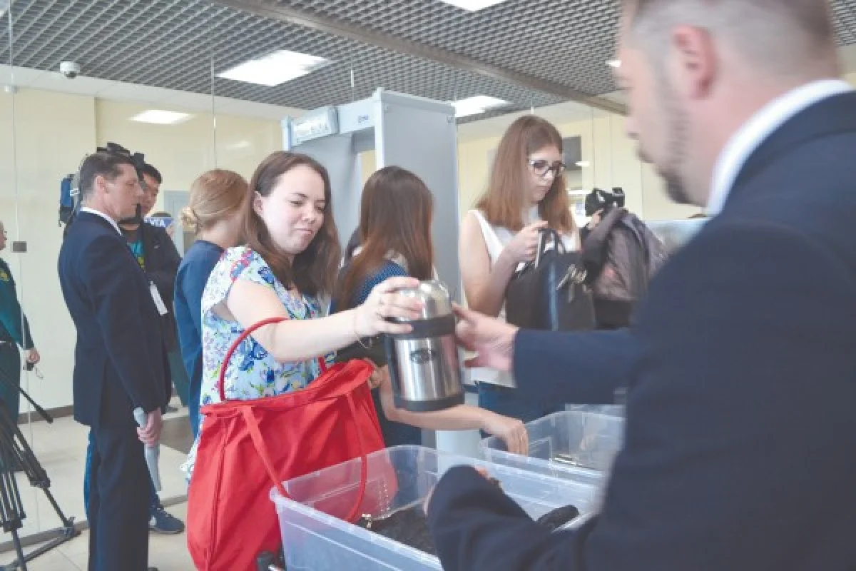 И действительно, поначалу ничего примечательного в багаже волонтёров обнаружено не было. Но вот подошла молодая девушка с цветастой дорожной сумкой, содержимое которой рассматривали сначала с помощью специального оборудования. Затем хозяйку попросили открыть кладь. В сумке оказался термос, который девушке пришлось отдать. Вернуть его обещали по окончании тестирования.