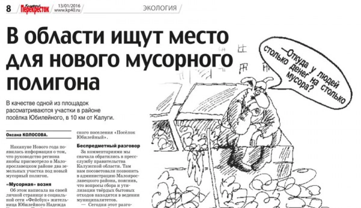 Очередной скандал по поводу утилизации твёрдых коммунальных отходов (ТКО) начал разгораться в регионе ещё накануне Нового года. Именно тогда появилась информация о том, что руководство области якобы присмотрело под новый мусорный полигон два земельных участка недалеко от посёлка Юбилейного в Малоярославецком районе общей площадью 45 га (см. «КП» № 2 от 13.01.2016). Новость обеспокоила не только местный народ, но и жителей деревень Жерело и Ильинка, расположенных в пригороде Калуги.
