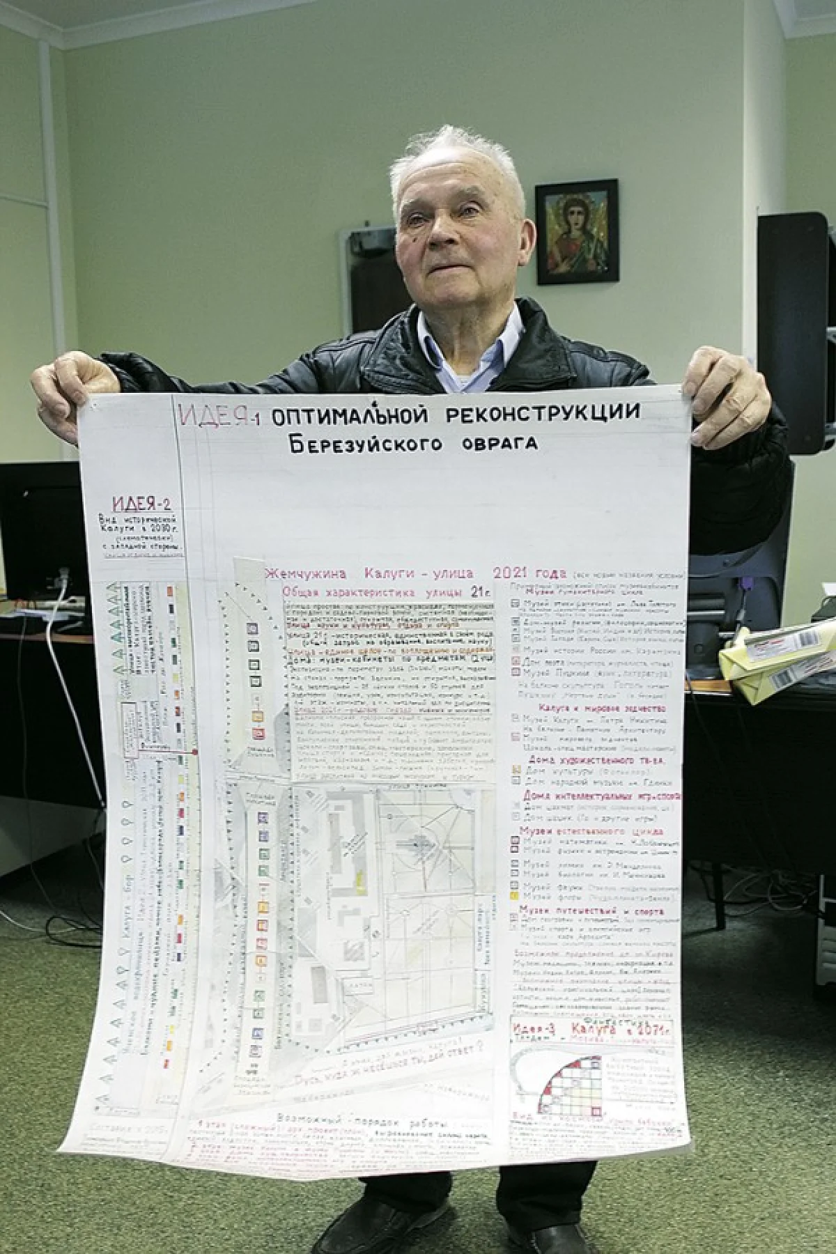 В разговоре с Владимиром Фроловичем выяснилось, что он, оказывается, больше года размышлял над будущим обликом этого места. Результатом долгих раздумий стала нарисованная от руки карта-схема под названием «Идея оптимальной реконструкции Березуйского оврага».