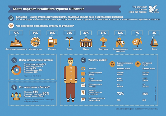 Согласно данным организации «Мир без границ», более половины от общего числа путешественников — женщины. Около 80% — это организованный поток через туроператоров. Средний возраст туристов — 50 лет. В первую очередь китайцев интересуют достопримечательности, затем — возможность попробовать блюда русской кухни и только потом — шопинг. Ну как без наших сувениров?