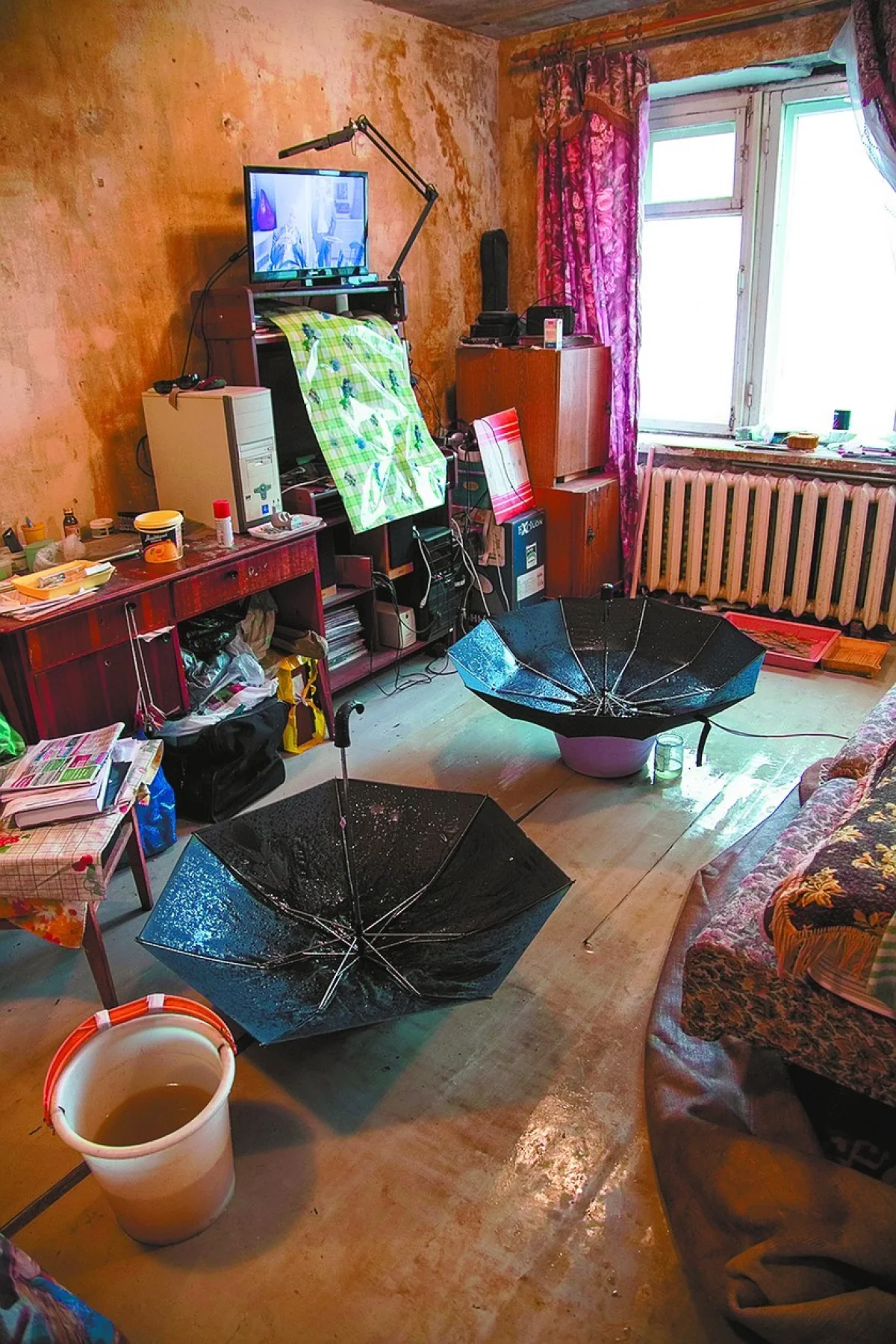 Отсыревшие, покрытые плесенью стены с остатками обоев, мокрый потолок, влажный пол - ещё немного, и квартира нашего фотографа Сергея Константинова станет напоминать декорации к фильму «Дети подземелья», хотя находится на самом верхнем, пятом этаже.