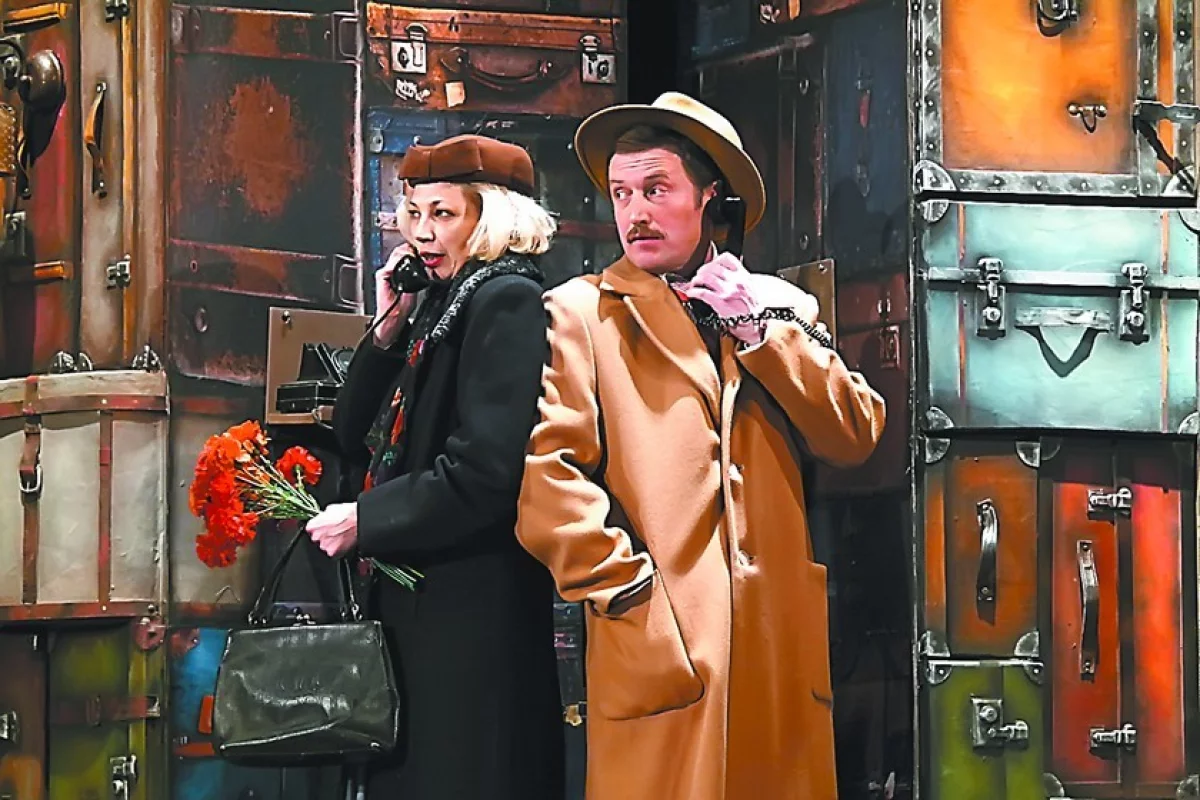 Это отлично поняли создатели спектакля и воплотили на сцене редкостно убедительный портрет времени, образ огромной неустроенной страны с толпами вырванных из почвы и носимых ветрами людей. Отсюда - хаотичное движение по сцене бедно одетых людей с чемоданами. Основным строительным материалом для декораций тоже становится чемодан. Такой спектакль наглядно демонстрирует тем, кто ещё не понял, действительную роль в театре художника-постановщика. И сегодня это Людмила Некрасова. Прекрасная работа! Из чемоданов она составляет интерьер квартиры. Лёгкий поворот конструкций - и перед нами плацкартное купе или помещение телеграфа. И всё - из чемоданов и каких-то фанерных ящиков. И вся жизнь - на чемоданах, вся какая-то коричневато-сероватая, неустроенная. Художник по костюмам Оксана Богданович тщательно одела персонажей в наряды, носимые скромными советскими людьми более полувека назад: полинялый халатик, длиннющее мужское пальто (его не шили, но строили), непритязательную молодёжную курточку и пр.