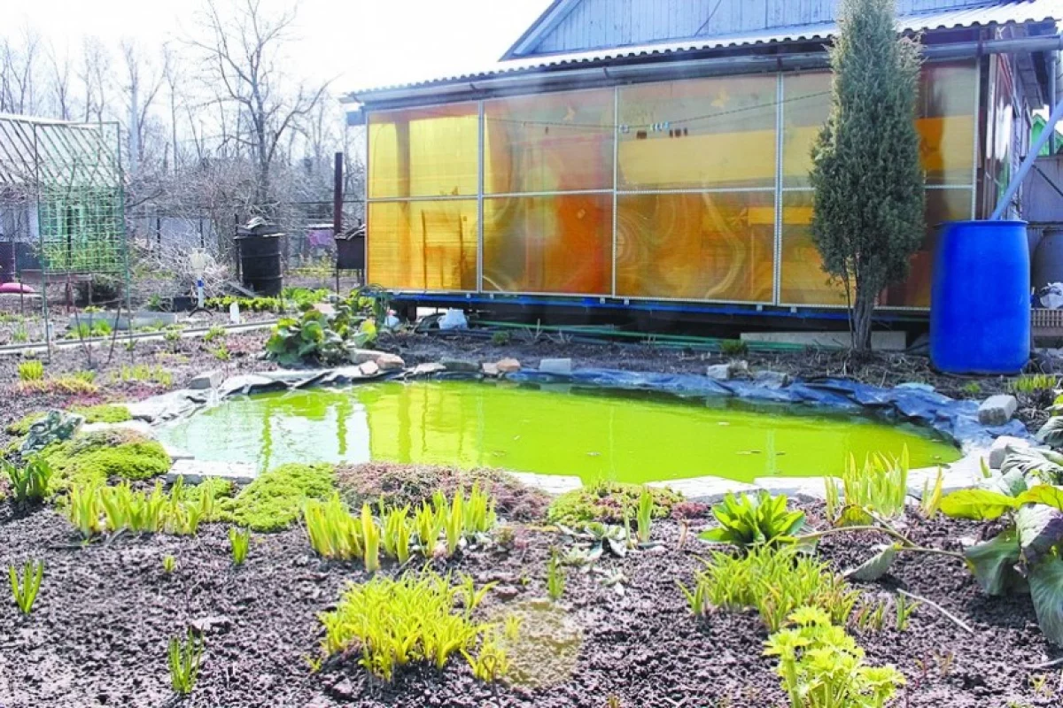 Беседуя, мы продолжаем обходить садовый домик по периметру: пионы, чубушник, кустик сирени — и вдруг перед нами оказывается небольшой пруд. Это настоящий водный цветник. Пока в нём нет растений, они появятся чуть позже, но вокруг уже «распушились» безвременники, чтобы осенью порадовать розово-сиреневыми цветами. На их фоне виднеется бадан. С одной стороны, это довольно неприхотливое растение, теневыносливое, но с другой — комфортнее оно чувствует себя на солнце, иначе цветов можно и не дождаться. Астильбы же прекрасно растут в тени.
