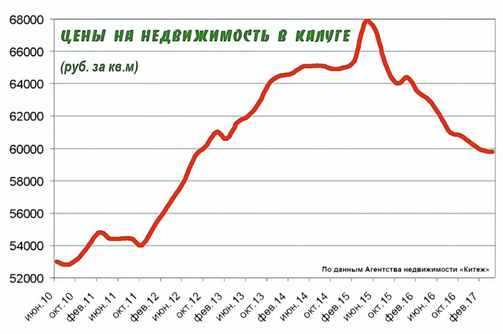 Агентство недвижимости «Китеж» проанализировало цены на квартиры в Калуге с июня 2010 года и получило чёткую «горку»: устойчивый рост цен до декабря 2014 года и затем такое же устойчивое снижение вплоть до настоящего времени. Сейчас, по данным риэлторов, средняя цена на квартиры в Калуге составляет чуть менее 60 тыс. руб. за кв. м.