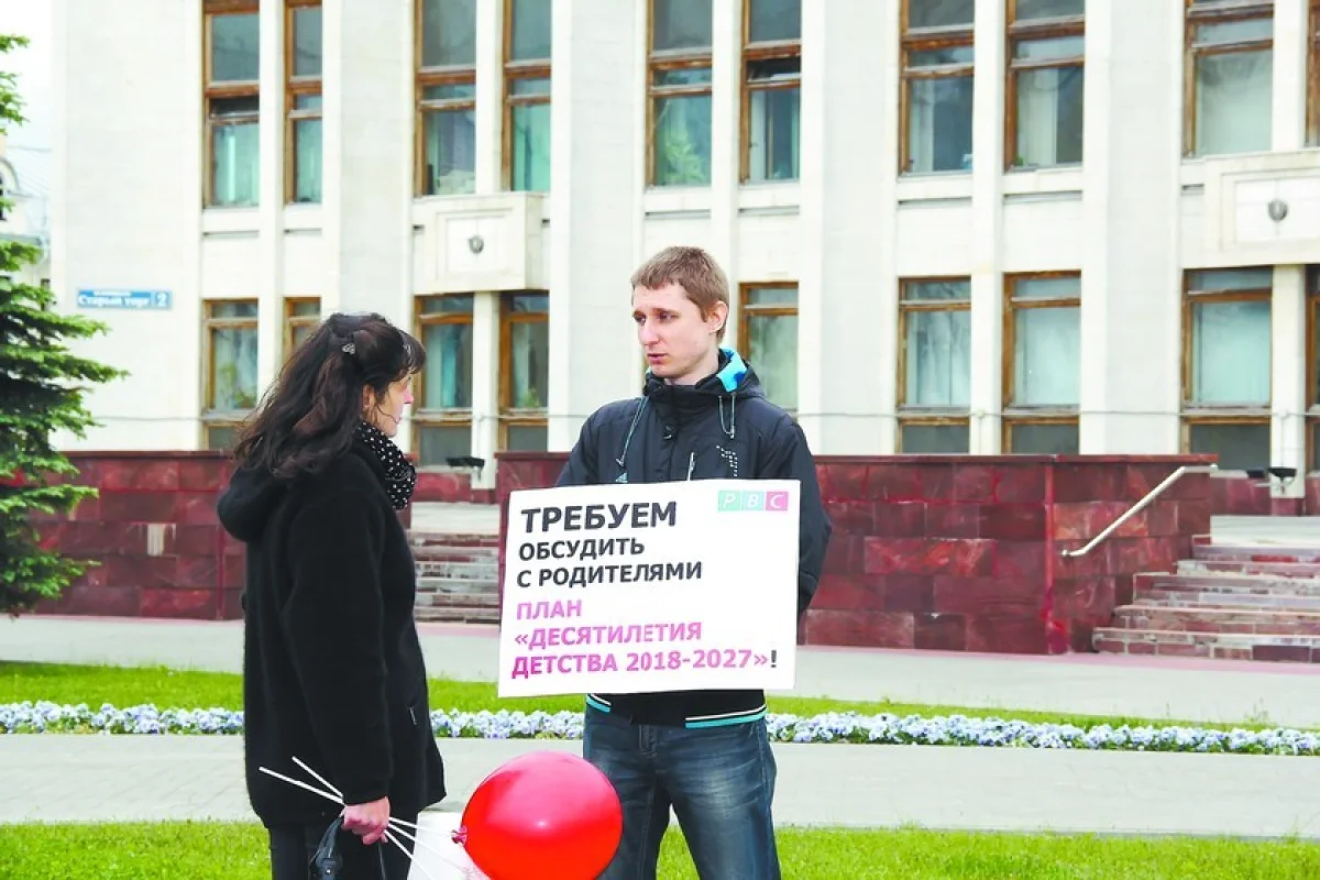 На площади перед «Белым домом» областной администрации и раньше было пусто, а после «переезда» памятника Ленину стало ещё просторнее. В воскресенье, 4 июня, здесь одиноко стоял парень. В руках - транспарант с непонятным для обывателя текстом: «Требуем обсудить с родителями план «Десятилетия детства 2018–2028». А тремя днями раньше у здания горуправы с этим же плакатом можно было увидеть девушку.