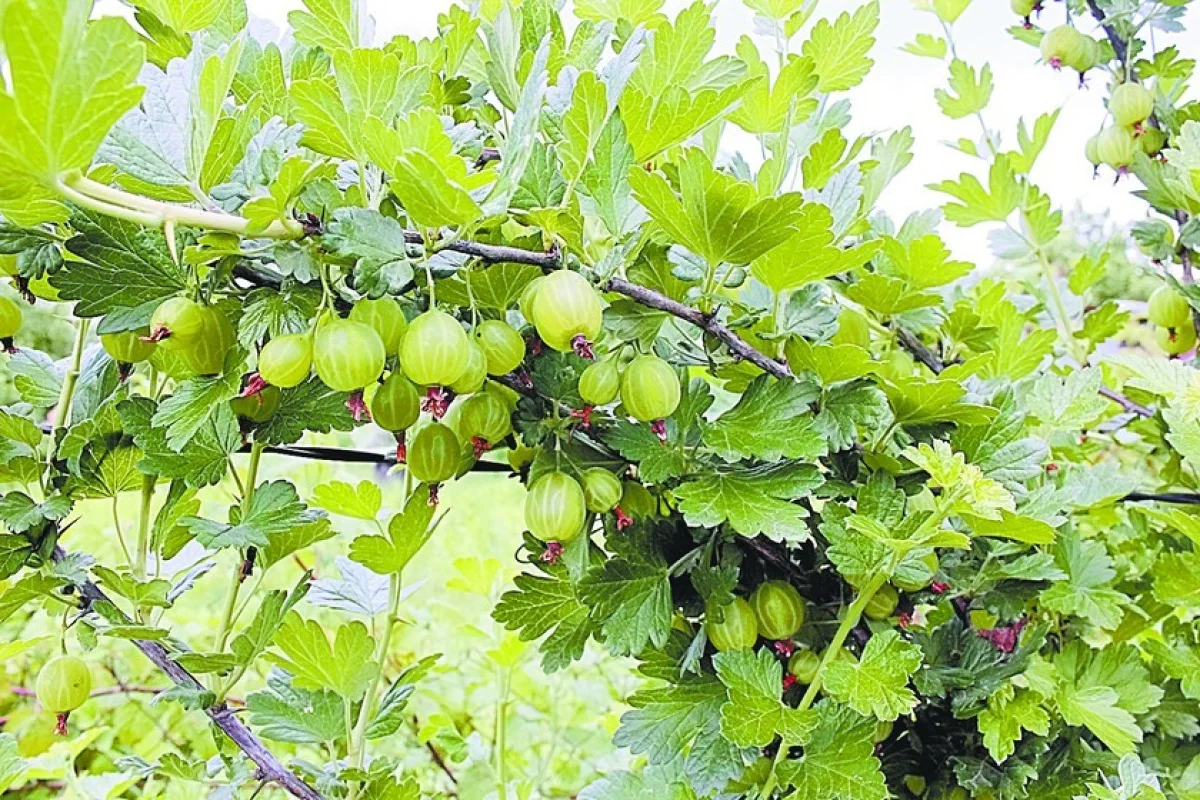 Крыжовник привязан к шпалере, благодаря такой «растяжке» с веток удобно собирать ягоды.