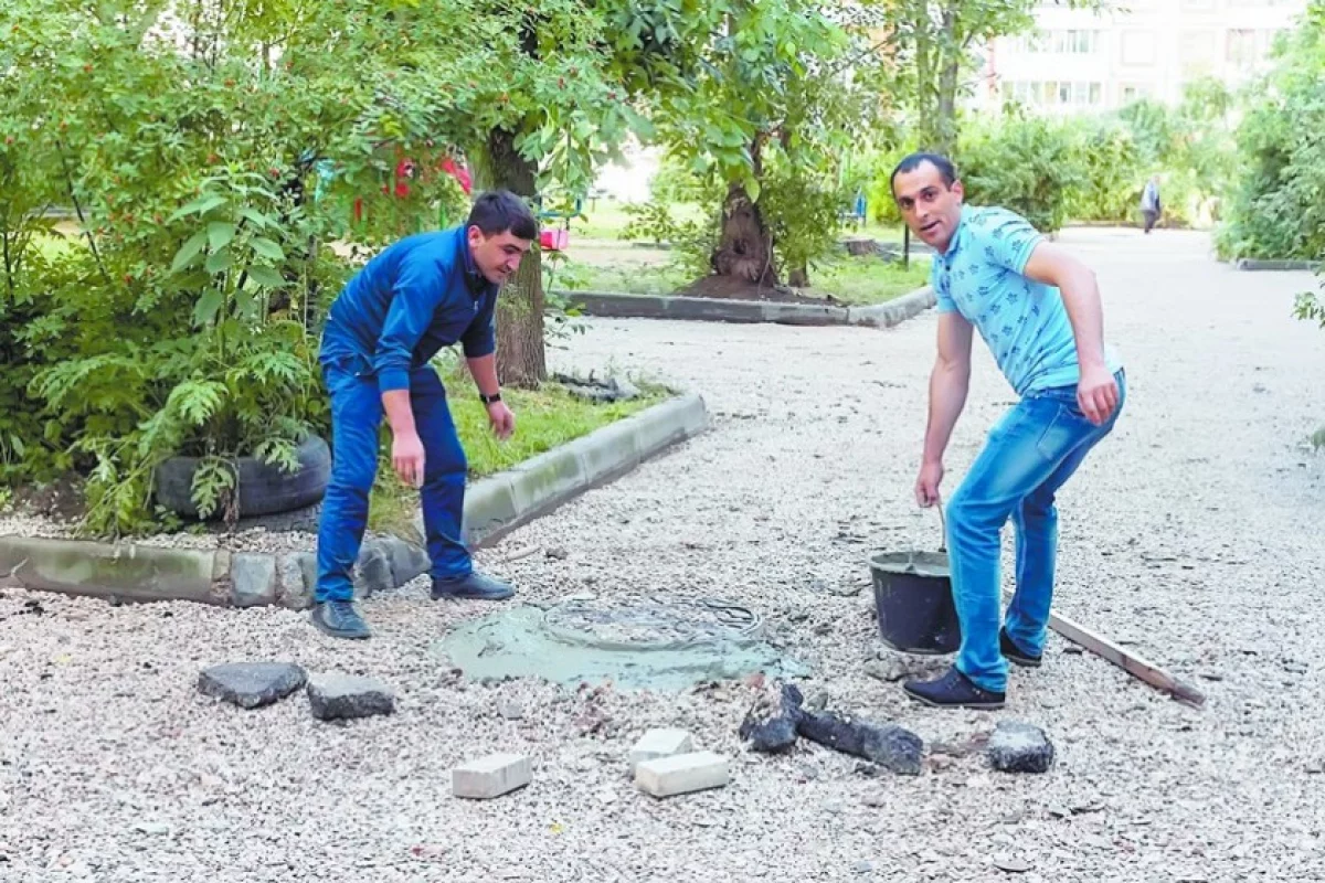 Во дворе на Труда, 26, стоит гул от работы техники. Здесь на днях должны положить новенький асфальт. Двор засыпан щебнем, расширены парковочные карманы. На наших глазах двое рабочих суетятся вокруг канализационного люка. Один обкладывает его обломками кирпичей, другой спешно заливает цементом. При виде журналиста и фотографа мужчины начинают заметно нервничать. В разговоре выясняется, что канализационный люк во дворе повреждён.