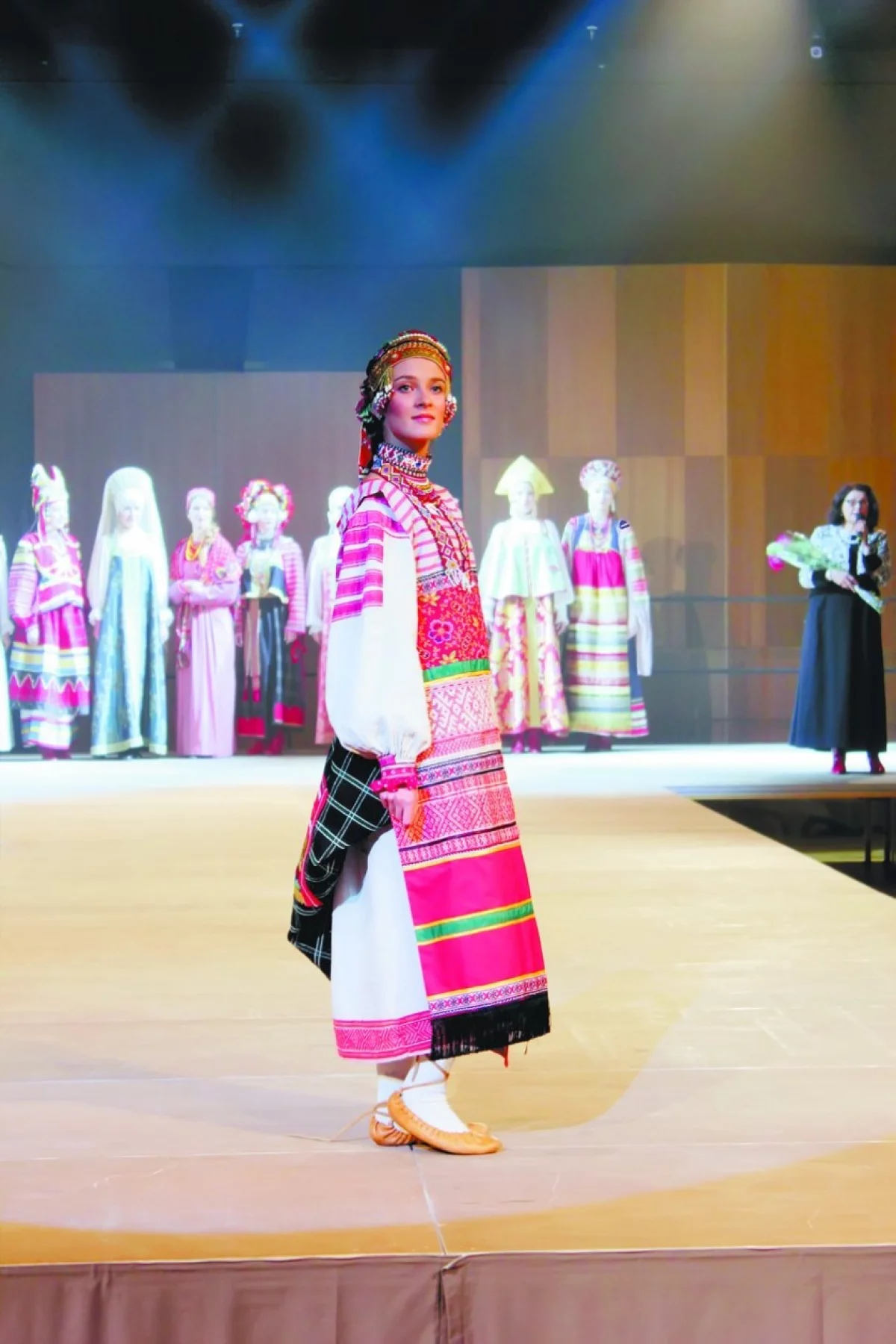 Показ был эксклюзивный. Впервые специально из Вены, где живёт Алла Денисова, коллекция была доставлена в Калугу. Здесь рязанский, калужский, курский, костромской, воронежский, архангельский, вологодский костюмы… Они расшиты золотом, украшены жемчугом — и каждый невероятно красив!