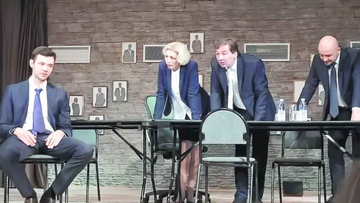 В начале спектакля на сцене одиноко пребывает некий джентльмен в самом возрастном соку и в хорошем костюме. Потом к нему присоединяются ещё двое мужчин при пиджаках и галстуках и элегантная дама в деловом же наряде.