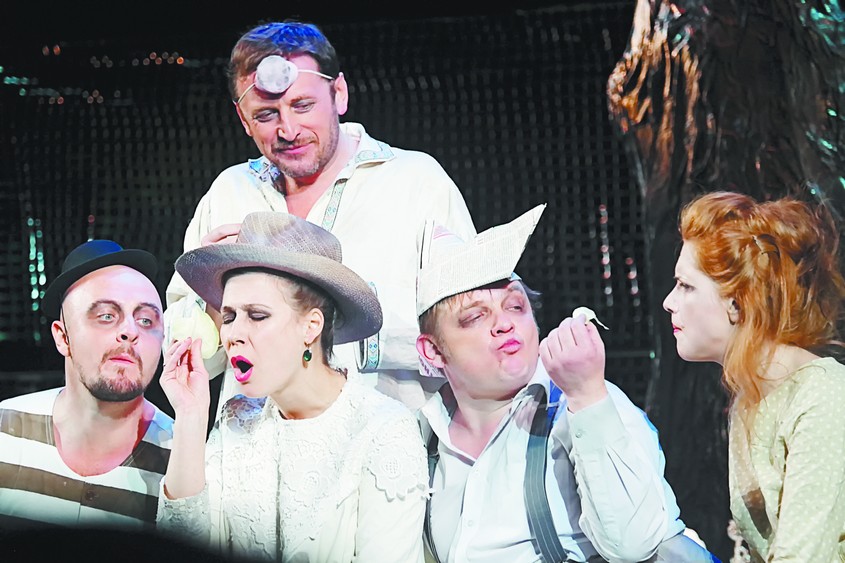 Выразительнейшая сценография Анатолия Шикули — могучие деревья, спокойно наблюдающие за суетой у подножия стволов. А свет Бориса Михайлова, музыка Натальи Голубевой и музыканты (Шафроненко–Бирюлин–Винокуров–Моисеев), сопровождающие действие, — полноценные действующие лица спектакля.