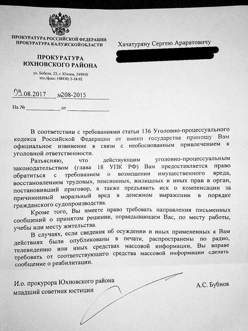 Областной суд отменил приговор, направив дело на новое рассмотрение в г. Кондрово. Честно говоря, в то время я уже в правосудие не верил. Но там оказался очень справедливый судья, он рассмотрел дело со всех сторон. Мне давали высказаться, внимательно выслушивали и вынесли оправдательный приговор. Прокуратура подала апелляцию, но оправдательный приговор остался в силе. А буквально через неделю из прокуратуры Юхновского района мне прислали извинения от имени государства за незаконное преследование.