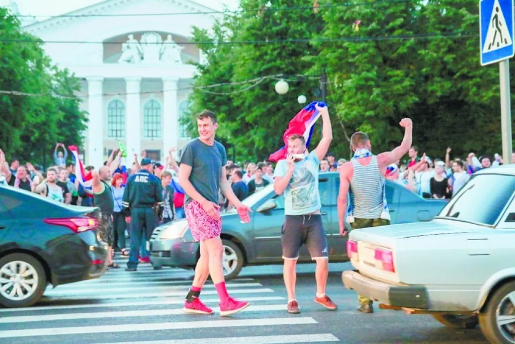 А в городе сразу после матча творилось что-то невероятное. Толпы фанатов с атрибутикой нашей сборной вышли на свежий воздух и заполонили улицу Кирова. По «гантеле» нарезали круги автомобили с флагами России, а от клаксонов гул стоял такой, что закладывало уши.