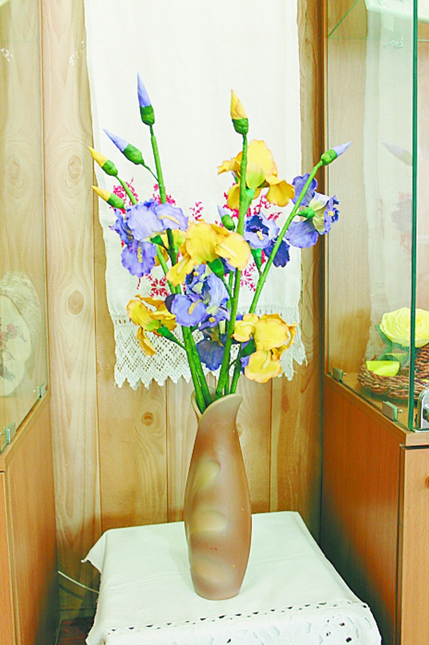 — Фоамиран — материал очень нежный, его можно перекрутить, порвать. Вот эти розы просто руками скручены, они нежные на ощупь, бархатистые. А ирисы сделаны на утюге, на паяльнике, чтобы придать волнистость. И на ощупь это совсем другой лист, более жёсткий. То, что сделано теплом рук, получается более нежным и тонким, — объясняет Татьяна ЕВСЕЕНКОВА. — А материал один и тот же. Интересно его тонировать. Для ирисов фоамиран был изначально сиреневатый, но, поскольку он подтонирован белым, а изнутри — жёлтым, цвет поменялся. Я вообще самая последняя пришла в клуб мастериц. Однажды увидела в Доме музыки вышивку лентами и записалась. Стала ходить, а Ольга Николаевна говорит: «У нас ещё декупаж есть!» Я и им заниматься стала. А потом сходила в цветочную мастерскую и поняла, что это мне нравится больше всего. Конечно, чтобы крутить фоамиран, нужны сильные пальцы и творческие наклонности. Фантазируешь! Цветы из фоамирана можно с сухоцветом сочетать — красивые композиции получаются. И хотя занятие это затратное, изыскиваем средства из своих пенсий. Даже врачи говорят: когда у человека есть увлечение, он депрессией не страдает. Нас объединяет общий интерес, и хочется, чтобы кому-то наши работы нравились.