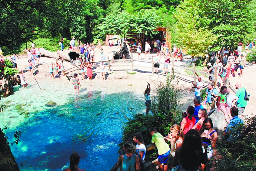 — Первую неделю мы просто отдыхали на море. Потом приелось, и решили поездить по окрестностям. Примерно в часе езды от Саранды есть карстовый источник «Голубой глаз». Мы прямо на улице взяли такси и доехали до этого места. Вода в источнике необычного цвета — голубая, а по краям тёмно-синяя. И ледяная! Источник глубокий, примерно 60 метров. Снизу бьёт столб воды, как обратный водопад. Вода, вырываясь наружу, бурлит и пузырится. Заходишь по колено, от холода ноги сводит. Но некоторые даже купались и прыгали с парапета смотровой площадки в воду. Чтобы сфотографироваться, приходилось терпеть, стоя неподвижно в ледяной воде, и дожидаться просвета в нескончаемом потоке людей.