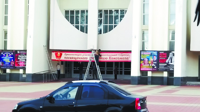 Над входом в филармонию рабочие натягивали плакат: «Приветствуем участников торжественного собрания, посвящённого 100-летию комсомола!». Рядом стоял раздрызганный ЗИЛ с подъёмником. Такой древний, что наверняка помнит Брежнева, а может, и Хрущёва.