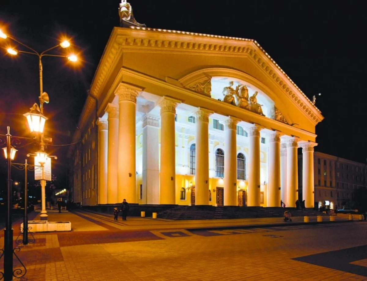 И в самом деле: оказавшись на широкой и просторной Театральной площади, пешеход невольно останавливается, впитывая державный размах здания. Мощные колонны поддерживают тяжёлый фронтон. По традиции, которой несколько тысяч лет, его положено украшать скульптурами богов и героев. Но было бы дерзостью со стороны советского архитектора изображать мифологические существа. Поэтому здание театра венчают мощные женские фигуры, одна из которых держит в руке лавровый венок — символ славы, другая раскрыла на коленях книгу. С двух сторон на дам взирают уже традиционные древнегреческие театральные маски, а в центре композиции расположился герб РСФСР. Смешение стилей и времён, над которым наш современник не очень-то задумывается. Может быть, и правильно делает. Поднявшись по широким гранитным ступеням, потенциальный зритель с трудом отворяет тяжеленную дубовую дверь, получая дополнительную дозу уважения к проделанной работе.
