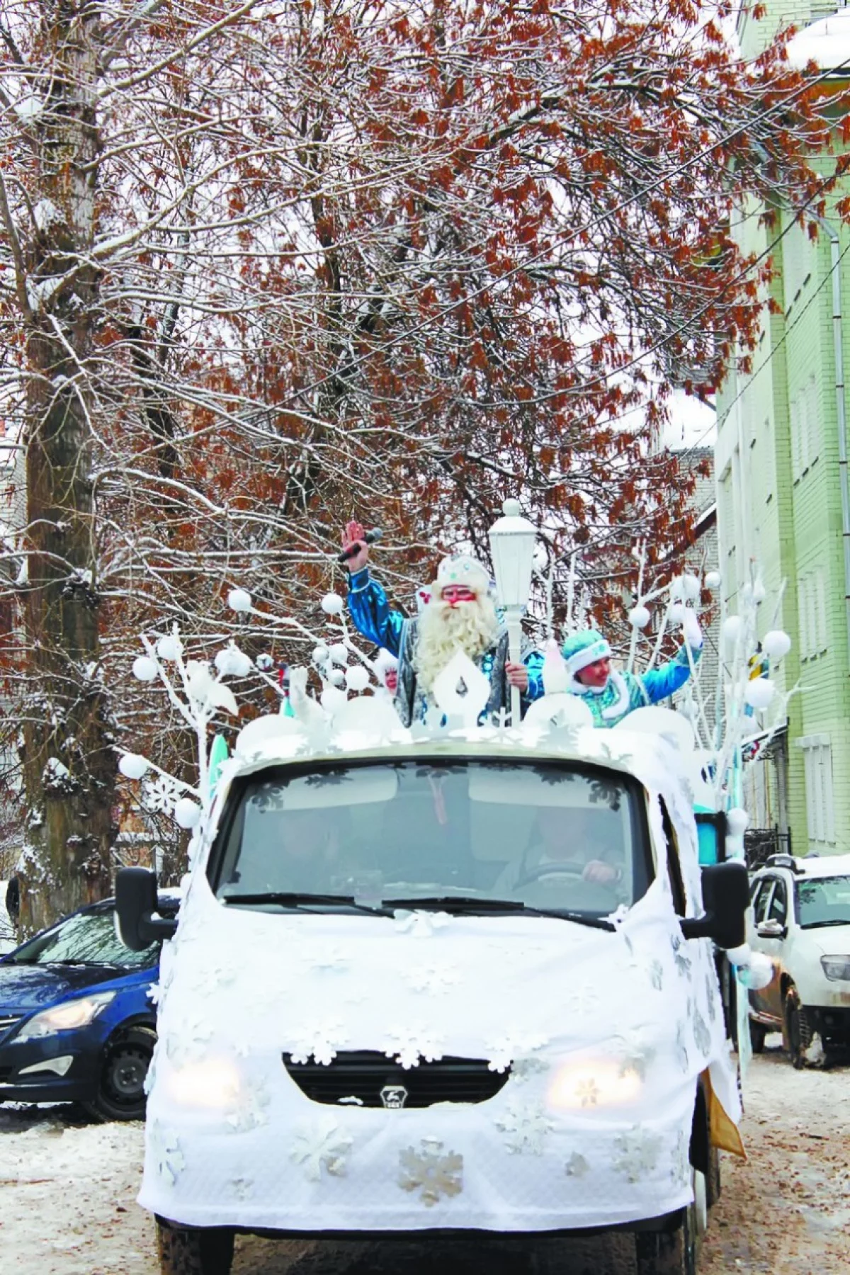Дед Мороз и Снегурочка появились ровно в полдень на автосанях, украшенных снежинками.