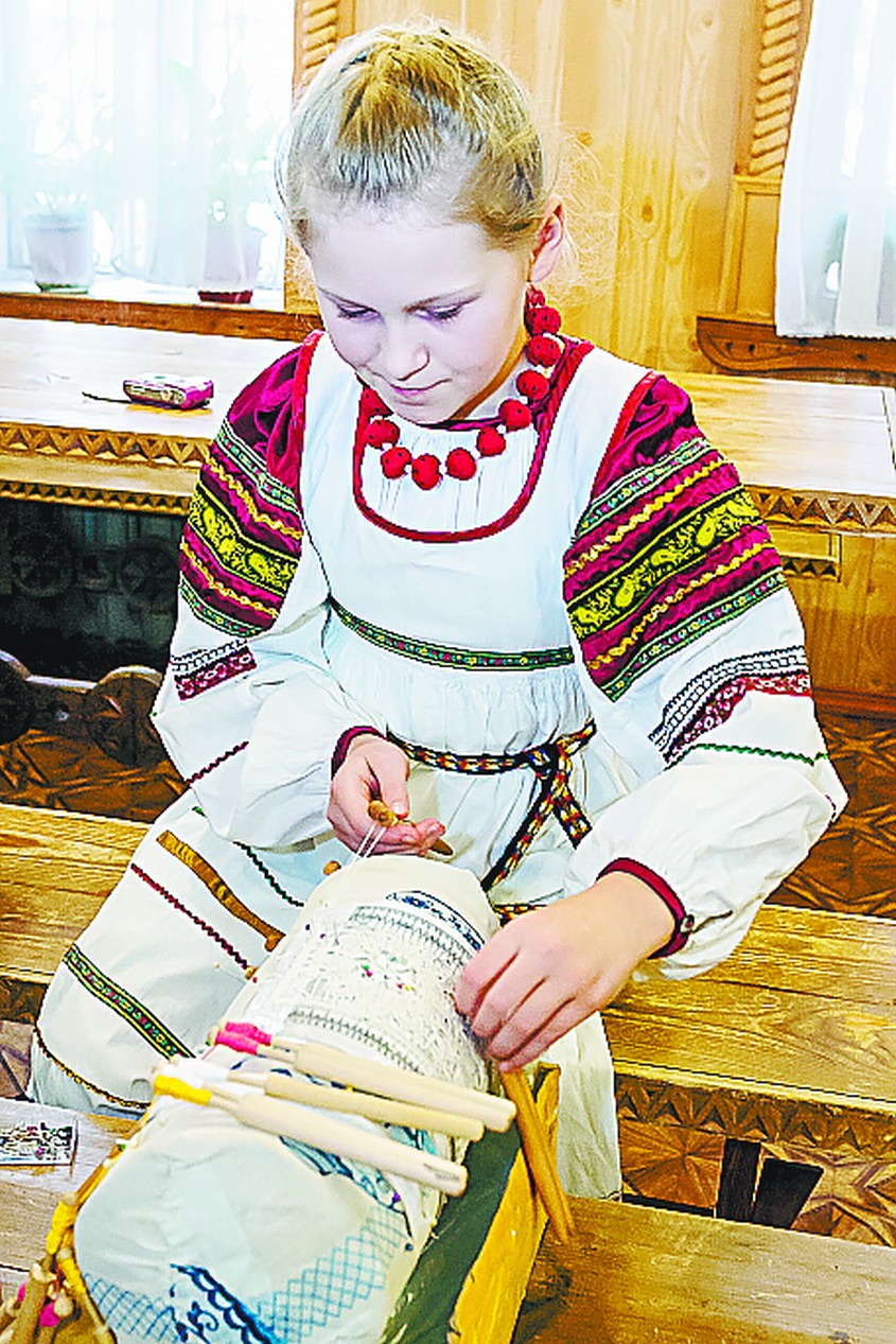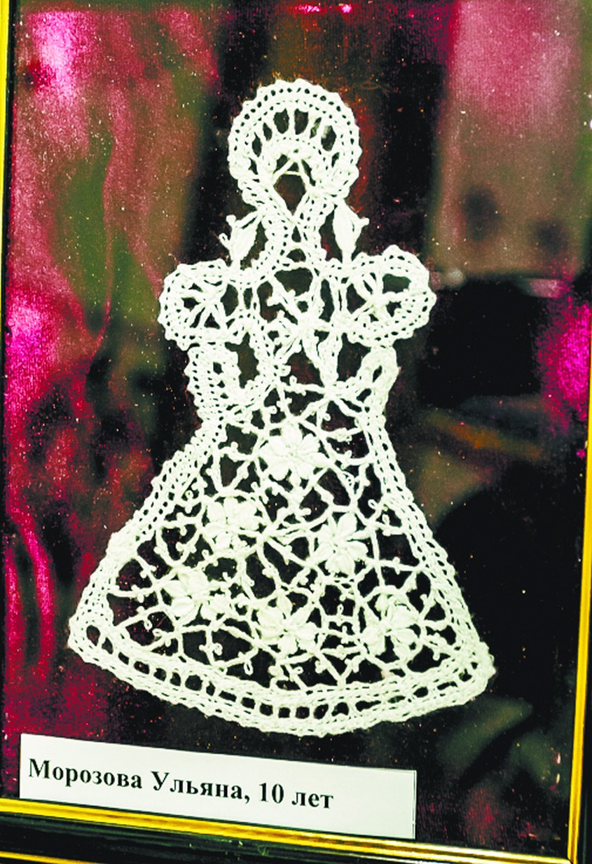 — Дома было скучно сидеть, и я пришла к Елене Михайловне. Она предложила заниматься лепкой из солёного теста. Мы лепили. А потом я увидела, как она плетёт на коклюшках. Захотела попробовать. Получилось. Занимаюсь второй год. Сделала ангелочка, бабочку, воротник, серёжки маме ко дню рождения. Вот плету салфеточку. Можно сплести маечки, футболки, панамки, шапочки. В Вологде даже свадебные платья плетут, но они очень дорогие — по 500 тысяч рублей. А там их покупают.